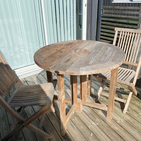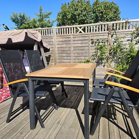 Bohor matgrupp för utomhusbruk i trä med brun lasyr. Gruppen består av ett avlångt, ovalt bord med ribbad bordsskiva och flera stolar med armstöd i samma träutförande. Passar på altan, uteplats eller balkong. Trämaterialet ger en stabil och tålig möbel för utemiljöer. Två iläggsskivor ingår. Dynor på stolarna kan användas för ökad sittkomfort, men ingår endast om det framgår i annonsen.