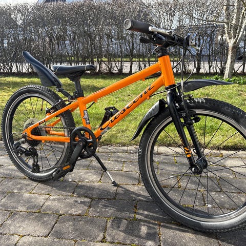 Crescent barncykel med 20" hjul. Cykeln har orange ram med låg instegshöjd och rakt styre. Utrustad med utanpåliggande växlar bak, skivbromsar fram och bak samt reflex fram och bak. Främre och bakre skärmar i svart plast skyddar mot stänk. Passar som vardagscykel för barn som behöver en cykel i 20-tumsstorlek för cykling till skola, fritidsaktiviteter och lek.