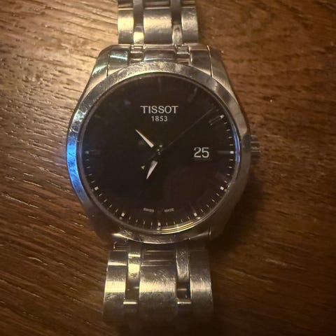 Tissot herrklocka armbandsur med svart urtavla och datumvisning vid klockan 6. Klockan har analog visning med tim-, minut- och sekundvisare. Boett och länk är i metall med klassiskt stålarmband och viklås. Passar som vardags- och dressklocka för man.