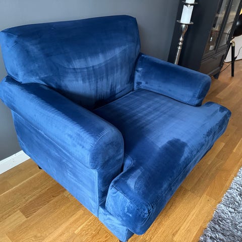 Fåtöljer i blå sammet med metallben. Rak, låg rygg och sits utan armstöd. Passar som extra sittplatser i vardagsrum, sovrum eller hall. Modern, enkel design med smala ben och stoppad sits och rygg för bekväm sittställning.