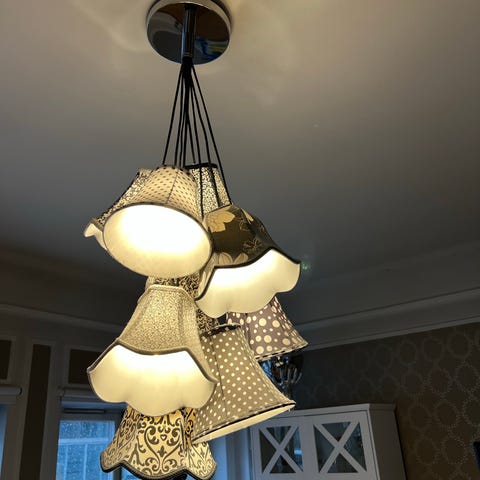 Taklampa (el nydragen) i kronmodell med flera armar i mässingsfärgad metall. Lampan har beige lampskärmar och dekorativa kedjor för upphängning i tak. Ljuskällorna är utformade som stearinljus med socklar i ljus färg. Passar som belysning i exempelvis vardagsrum, matsal eller hall. Exakta mått och sockeltyp framgår inte av uppgifterna och kan behöva kontrolleras vid behov.