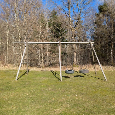 Stabil gungställning i metall. Stativet består av en överliggare och fyra ben i rörkonstruktion. Avsedd för montering av flera gungor.