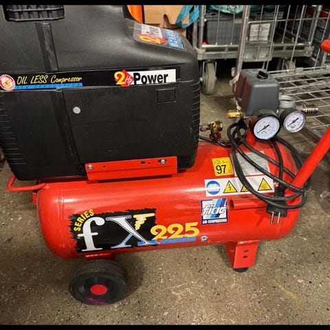 Okänd kompressor på hjul i blått utförande. Kompressorn är monterad på en vagn med två större hjul bak för enklare förflyttning. Utrustad med eldriven motor, lufttank och skyddsgaller runt kompressordelen. Passar för tryckluftsverktyg och andra arbeten där portabel tryckluft behövs.