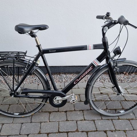 Crescent herrcykel med ramstorlek 56 cm och 28" hjul. Cykeln har upprätt sittställning, stänkskärmar och kedjeskydd. Utrustad med fotbroms bak och handbroms fram. Passar för vardagscykling och pendling för vuxen man i normal- till längre längd, anpassad för standard 28"/700c-hjul. Aldrig använd. Kvitto finns. Redigt oanvänt AXA lås följer med. Kan ses/hämtas i Sollentuna, Stockholm.