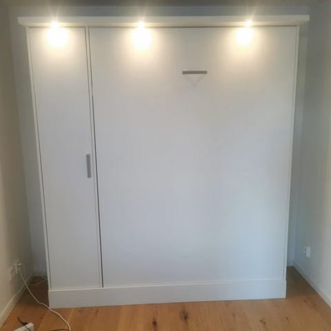 Sängskåpet är monterat på väggen och kan provas på plats.