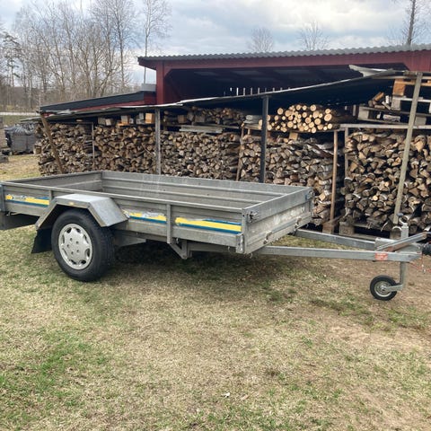 Släpvagn med öppet flak och enkelaxel. Längd 2580mm. Flakets botten trasigt (plyfa). En baklampa fungerar, kablar till övriga behöver lagas. Lämmar hela men något böjda. Renoveringsobjekt. Avställt sen flera år. Har använts för transport av exempelvis byggmaterial, trädgårdsavfall.