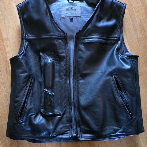 Västen är utrustad med D-Air-system (airbag) för skydd vid motorcykelkörning. Den har dragkedja framtill och är främst utformad för att bäras under motorcykeljacka men fungerar även utanpå. Materialet är textil med stretchpaneler för bättre passform. Den levereras med medföljande dokumentation/manual enligt bild.