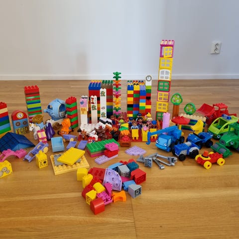 Större mängd LEGO DUPLO från flera olika byggsatser. Åtskilliga djur, människor och fordon.