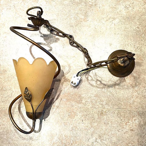 Taklampa med kedjeupphängning i metall och trädetaljer. Lampan har dekorativa metallarmar och en kedja för upphängning i tak. Passar för montering med glödlampa i vanlig lamphållare. Lämplig som belysning i exempelvis vardagsrum, hall eller matsal. Elanslutning och upphängning kan behöva ses över innan användning.