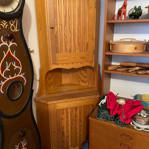 Hörnskåp som är delbart i två delar. I använt skick men har fortfarande mycket kvar att ge. Mått ca 180cm högt, 80cm bred (mätt på det bredaste stället) och djup ca 50cm. Finns i centrala Nynäshamn.