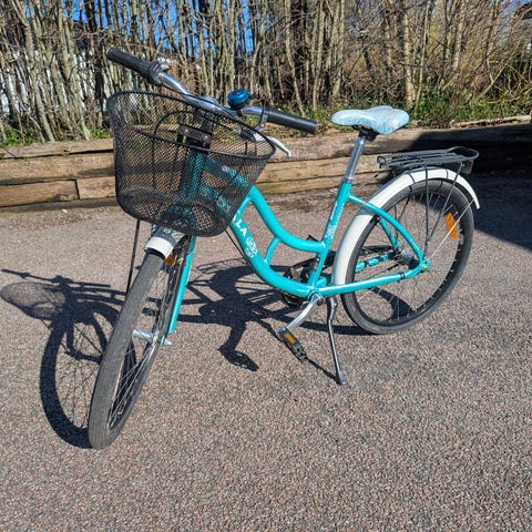 Cykeln på bilden är en Btwin Original 500, en 24-tums hybridcykel i blå/turkos färg. Den är specifikt utformad för barn i åldern 9 till 12 år (med en längd på cirka 135 till 150 cm).