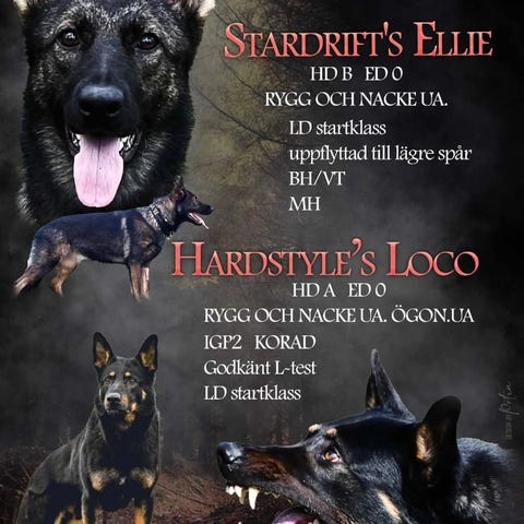 Schäfervalpar födda 4 april efter polishund Försvarsmaktens Redik och Azlangården Ester. Kombinationen görs nu för andra gången och förväntas som tidigare ge stabila hundar med hög användarvänlighet. Redik kombinerar stabilitet och drift med en hög samarbetsförmåga. Rediks bror används som avelshund inom försvarsmakten för deras fortsatta avel. Redik är en hund som har mycket lätt att koppla av och den egenskapen delas av Ester varför kombinationen borgar för hög användbarhet. Azlangården har nyttjat Esters linje i flera kombinationer tidigare med bra resultat utifrån mentalitet och hälsa. Kombinationen ger ett starkt ledindex både på höft och armbåge.