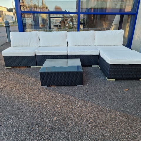 Modulsoffa I 4 delar som hakas I varandra. Sittdynor är tvättade men inte ryggdynoorna, då det inte går. Det finns lite fläckar på några av dynorna, men går säkert bort med ånga eller skrubbning. Jag kommer dock inte lägga ner tid på detta, då jag säljer från ett dödsbo. Bara bordet har kostat 4400 kr och det är i fint skick. Fattas några av knapparna på några dynor, zooma in så ser ni på bilderna.