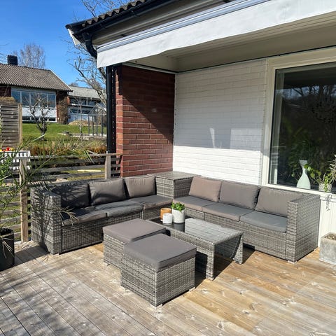 Hörngrupp utemöbler i konstrotting med tillhörande matbord. Soffan är utformad som en hörnsoffa med sits- och ryggdynor i beige tyg. Stommen är flätad i grå konstrotting. Bordet har rektangulär bordsskiva i trä- eller träimitation i beige ton och ben/stomme i matchande konstrotting. Passar för uteplats, altan eller trädgård för sittgrupp och matplats utomhus.