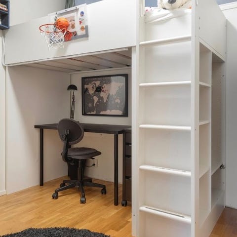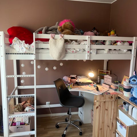 Loftsäng i trä med integrerade hyllplan och arbetsyta under sängen. Stege på sidan för uppgång till sängen. Perfekt för juniorrum där man vill kombinera sovplats med förvaring och skriv-/lekutrymme under loftet. 90?cm madrass, ingår ej.