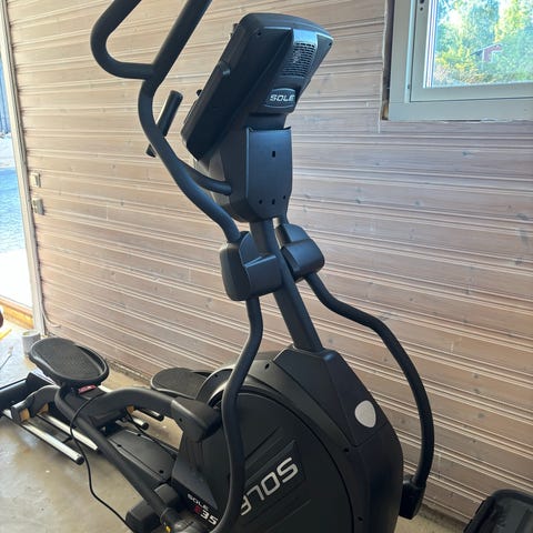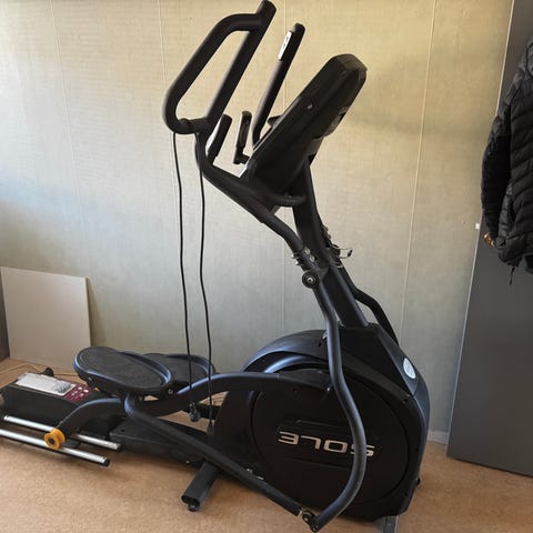 Sole E35 crosstrainer i svart utförande. Maskinen har framhjulsdrift och fasta samt rörliga handtag för både över- och underkroppsträning. Displayen visar grundläggande träningsdata som tid, hastighet, distans och uppskattad kaloriförbrukning. Fotplattorna är justerbara för att anpassa steglängd och fotvinkel. Crosstrainern är lämplig för konditionsträning och lågintensiv helkroppsträning i hemmet.