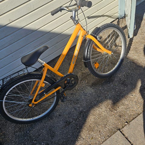 Säljer en fin barncykel från Kärnan med 20” hjul i snygg orange och rosa färg. Cykeln är mycket lite använd och i gott skick.