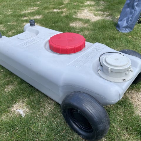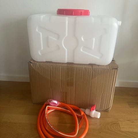 Dunken har bärhandtag upptill och är avsedd för förvaring och transport av vätska.