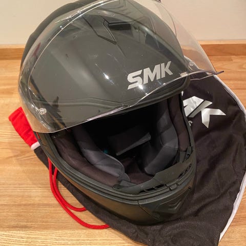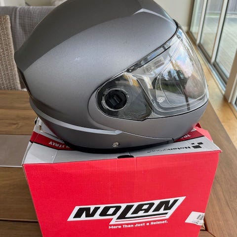 Schuberth integralhjälm i silverfärg, storlek 54/55. Hjälmen har uppfällbart visir och integrerat solvisir. Ventilationsöppningar finns upptill och bak för luftflöde. Den främre delen av hjälmen är uppfäll-bar. Invändigt finns vadderad inredning och hakrem med snabbspänne. Passar motorcykel- eller skoterkörning där en sluten hjälm önskas. En lika-dan hjälm i storlek 58/59 medföljer om så önskas, utan kostnad eftersom fodret är skadat.