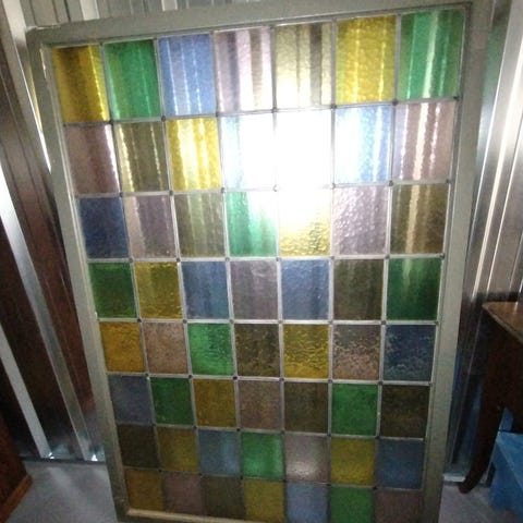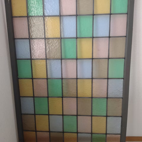 Rektangulärt fönster med färgat glas i flera nyanser. Tvåglasfönster som består av många små rutor i olika färger, bland annat grönt, blått, lila och brunt. Glasrutorna är monterade i ett ramverk som kan användas som dekorativt inslag i exempelvis bostad, friggebod eller uterum. Passar som insynsskyddande fönster eller som ljusinsläpp med färgeffekt.