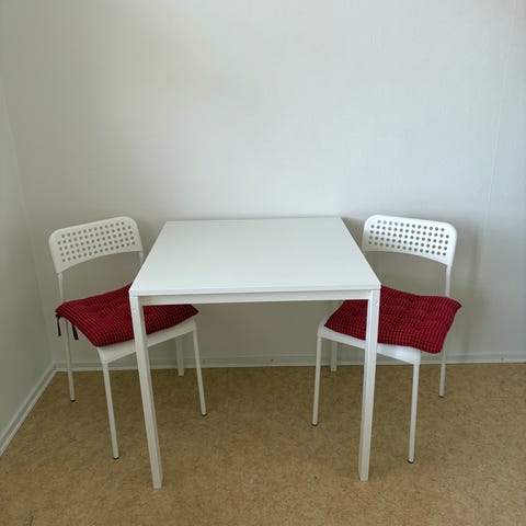 Ett par märken på bordsskivan och en av stolarna har en fläck på dynan. I övrigt väldigt fint skick.