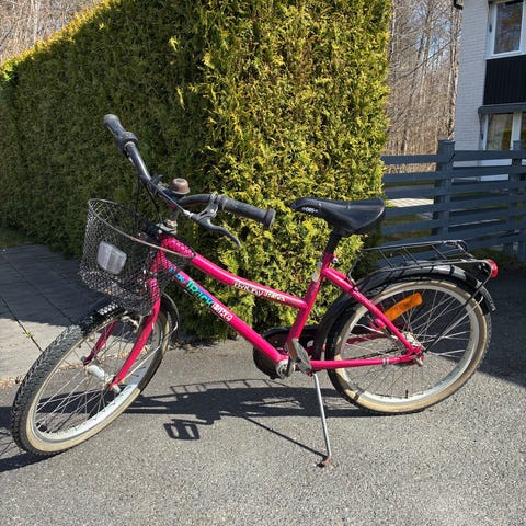 TWS barncykel med 20" hjul. Cykeln har orange ram, svart sadel, svarta skärmar och pakethållare bak. Utrustad med kedjeskydd, reflexer och fotbroms bak. Sadeln är sprucken enligt bild. Lämplig som enkel vardagscykel för barn i den storlek som passar 20" hjul.