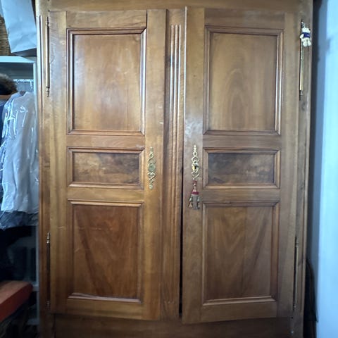 Vackert skåp i trä med dubbeldörrar. Skåpet har två övre lådor och två dörrar nedtill med nyckelhål. Invändigt finns flera hyllplan som ger plats för förvaring av exempelvis porslin, köksredskap eller textilier. Passar i kök, vardagsrum eller hall som förvaringsmöbel.