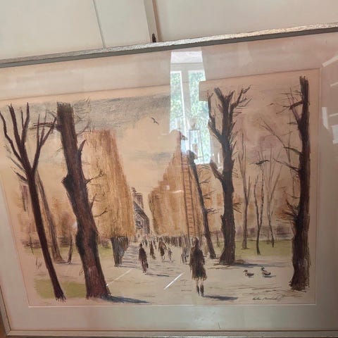 Tavla med motiv av personer som spelar musik och dansar i en inomhusmiljö. Bilden går i blå och dova toner och är inramad med passepartout och enkel ram. Passar som väggdekoration i vardagsrum, hall eller andra rum där man vill ha ett större konstmotiv på väggen.