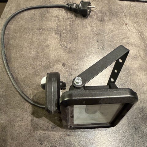 Strålkastare och utelampor för utomhusbelysning. Paketet innehåller flera väggmonterade strålkastare med rörelsesensor samt en cylinderformad utelampa i metall och glas. Lamporna är avsedda för montering utomhus, exempelvis vid garage, uppfart eller entré. Passar för allmän belysning av gårdsplan eller fasad. Exakta effektvärden, mått och ljuskällor framgår inte av uppgifterna.