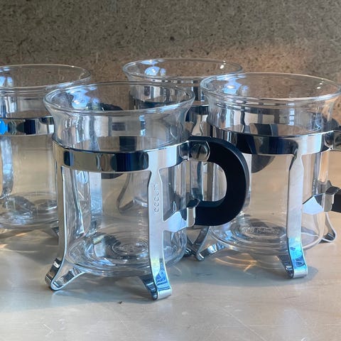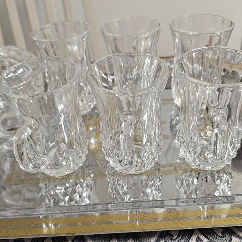 Handmålade teglas, antagligen polska, med hållare i metall säljes. Glasen är målade i guld, vitt och rött. Glasen rymmer 2,6 dl och är i mycket gott skick. Det finns 7 glas och 6 hållare.