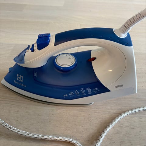Tefal Express Easy Control ångstation med separat vattenbehållare och strykjärn anslutet via slang. Enheten har blå vattentank med anti-kalksystem (Anti-Calc Collector) och panel med Easy Control-funktioner, inklusive ECO-läge.