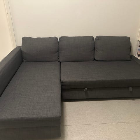 Bäddsoffa från xxxlutz i mörkgrått tyg. Vänster schäslong/divan 80cm bred med ~60x144cm förvaringsutrymme under. Lösa ryggkuddar.