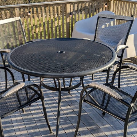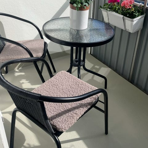 Trädgårdsset med runt bord och stol i grå färg.