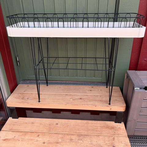 Äldre wodford hylla. Stabil stålställning. Plasthyllor.