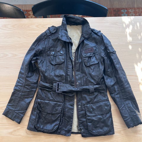 Slitstark, tidlös, skyddar i alla väder. Använd en säsong. Pelle P = väldigt bra kvalitet.