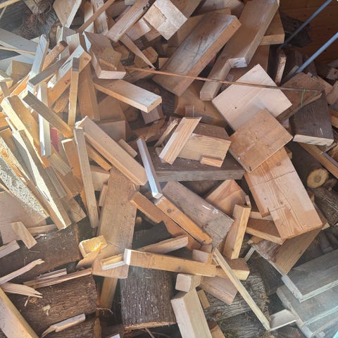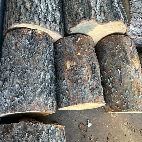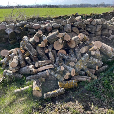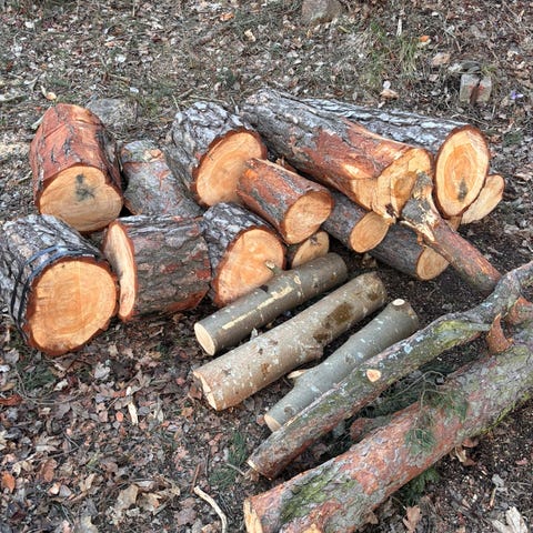Vedkubb 30-35 cm i varierande tjocklekar. Kubik oklart men kommer från tre träd (cypress, lönn och sälg) som fälldes den 4 april 2026.