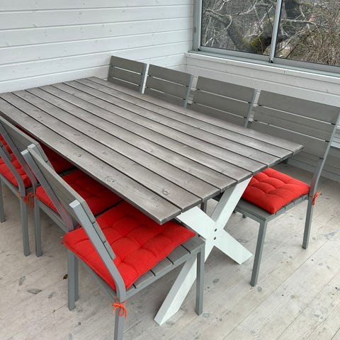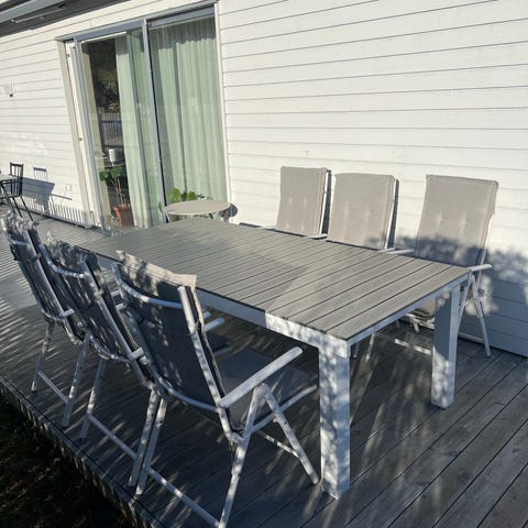 Matgrupp för utomhusbruk bestående av rektangulärt bord och flera stolar. Bordsskivan har längsgående gråa ribbor och benen är i metall med kryssformad konstruktion. Stolarna har metallstomme med grå sits och ryggstöd samt lösa dynor. Passar som trädgårds- eller altanmöbel för flera sittplatser runt bordet.
