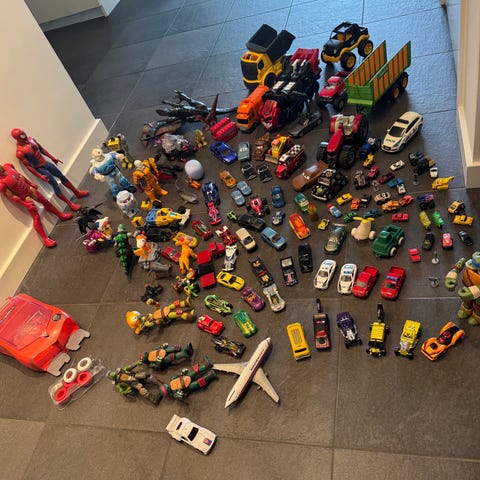 Ett set med leksaksfordon. Inkluderar en Batman terrängbil, en Batman motorcykel, en Iron Man motorcykel och en terrängbil. Säljes i befintligt skick