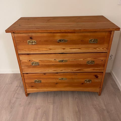 Nätt byrå i trä med 3 lådor med fina beslag märkta AB Br. Miller. 1 trasigt beslag, Se sista bild.