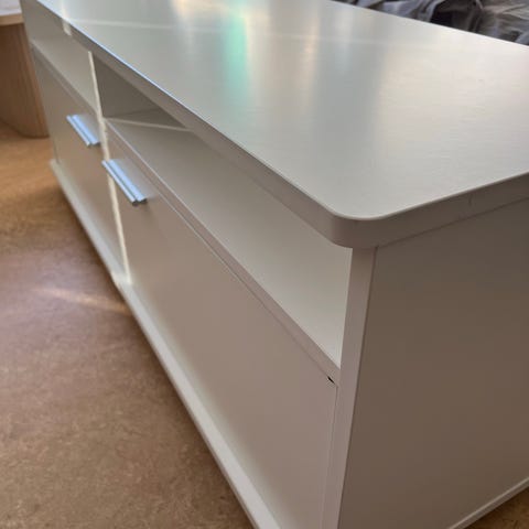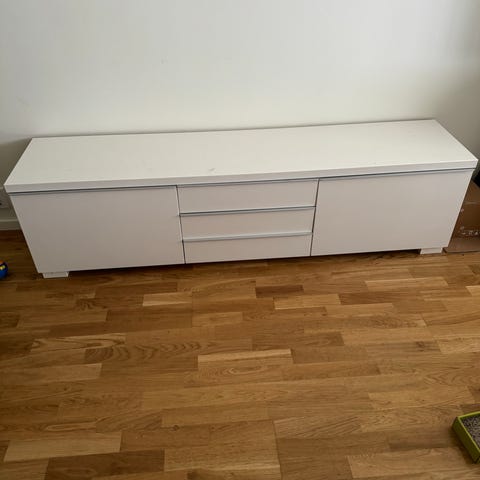 IKEA tv-bänk i vit färg. Bänken har två dörrar framtill och invändiga hyllplan som ger förvaring för exempelvis mediautrustning, spelkonsoler eller andra tillbehör. Slät ovansida som kan användas för tv eller annan utrustning. Passar i vardagsrum, sovrum eller andra rum där extra förvaring och avställningsyta behövs.
