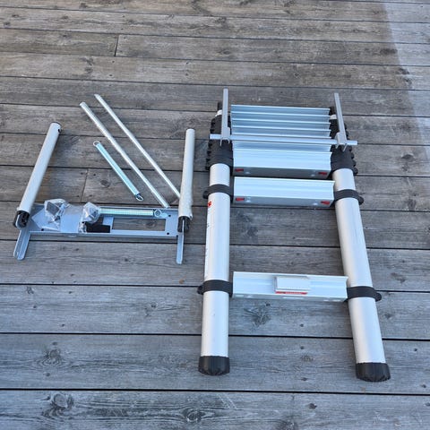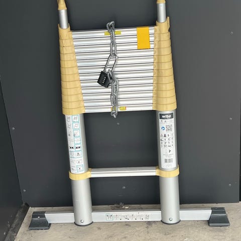 Vikbar stege från Wibe. Stegen består av flera sektioner som kan fällas och låsas i olika lägen, vilket gör att den kan användas både som rak stege och arbetsplattform.