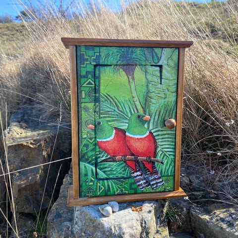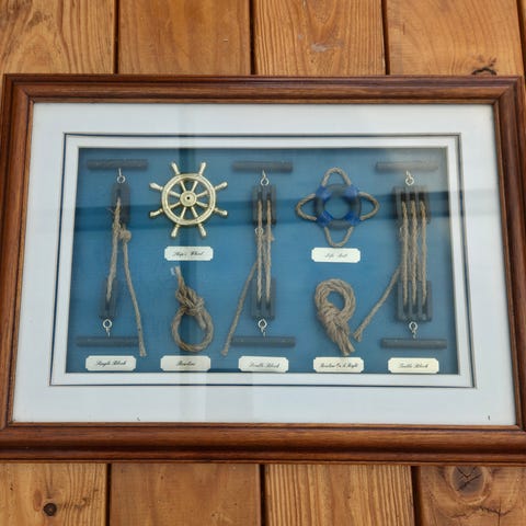 nautisk knoptavla i en träram med glasfront, dekorativt nyckelskåp.