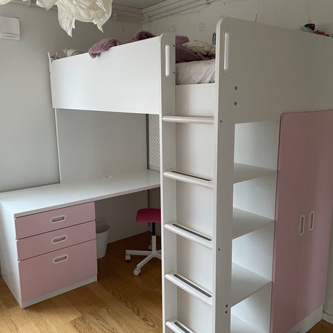 Vit tidig variant av Småstad loftsäng med integrerat skrivbord och hylla. Lådorna på hurtsen och dörrar till garderoben är rosa.