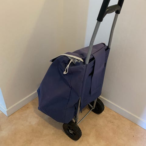 Gimi shoppingvagn i blå textil med dragkedjefack på sidan och dragskostängning under locket. Vagnen har två hjul, stadigt handtag och ram i metall/plast. Passar för transport av matvaror eller andra vardagsärenden.
