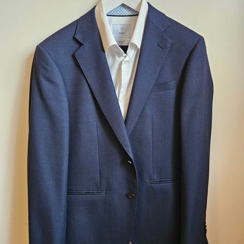 2 st Bläck kostymer från MQ ”Tailored fit”i nyskick. 1 blå och 1 mörkgrå. Byxor i storlek 46 och kavaj i storlek 48.