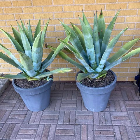 6 år gammal agavekaktus som har breda, spetsiga blad i grönt med ljusare kanter.