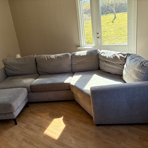 Säljer en stor och bekväm hörnsoffa i grått tyg. Nypris ca 15 000–25 000 kr.