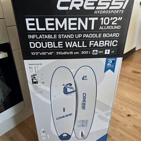 Uppblåsbar SUP. Komplett med: Ryggsäck, paddel, pump, leash. Lite använd och sedan stått lagrad i 4 år (torrt). Säljes pga flyttat till utlandet.