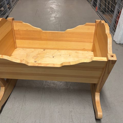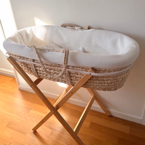 Fin Moses vagga från Petit Cherie med stativ i vit färg. Vaggan består av en korg med bärhandtag och vit textilklädsel samt madrass. Den står på ett fristående vitt trästativ som håller korgen i en bekväm höjd. Passar som sovplats för spädbarn i hemmet, exempelvis bredvid föräldrarnas säng eller i barnrummet.