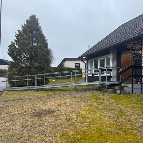 Rullstolsramp i modulärt system av metall i grå färg. Rampen består av flera sektioner med plan viloyta och räcken på båda sidor. Gallerförsedd gångyta ger bra dränering och halkskydd. Konstruktionen är avsedd för utomhusbruk och kan användas för att skapa tillgänglig entré till exempelvis bostad, lokal eller altan. Sektionerna kan i många fall anpassas efter befintlig höjdskillnad och placering vid fasad eller veranda.